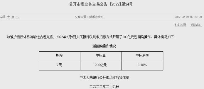 中新財(cái)經(jīng)2月9日電 據(jù)央行9日消息,為維護(hù)銀行體系流動性合理充裕,2022年2月9日人民銀行以利率招標(biāo)方式開展了200億元7天期逆回購操作,中標(biāo)利率2.10%,與此前持平。 鑒于9日有2000億元逆回購到期...