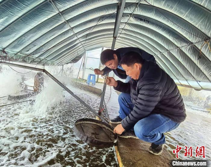 黃華強(前)與黃育成交流對蝦養(yǎng)殖技術(shù)。 張鐵國 攝 (新春走僑鄉(xiāng))僑鄉(xiāng)福清留守“場長”的好日子 中新網(wǎng)福州2月3日電 (張鐵國)位于僑鄉(xiāng)福建福清市興化灣西港古老的郎官渡口附近,昔日的灘涂如今...