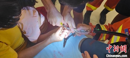 救援人員立即展開(kāi)救援,先用剪刀將卡手的鋼管剪開(kāi)一個(gè)豁口,隨后用鉗子順著鋼管邊緣慢慢剪開(kāi),將早已準(zhǔn)備好的切割器墊片塞入卡手的鋼管內(nèi),用切割器對(duì)鋼管進(jìn)行切割。救援過(guò)程中,女童不哭不鬧,反而安撫施救人員說(shuō),“我都不痛,你緊張啥”。
