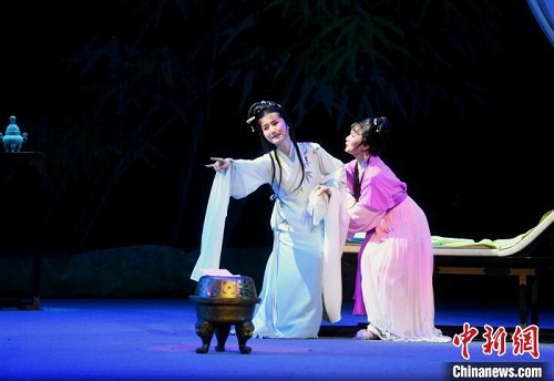 國家一級演員、張派非遺傳承人鄭全(左)等演出越劇《紅樓夢·焚稿》經(jīng)典名段?!∮浾邉⒖筛z