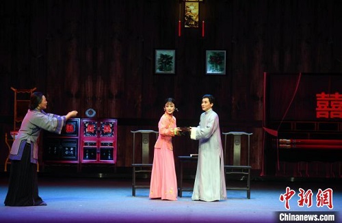 國家一級演員、中國戲劇梅花獎得主、尹派非遺傳承人陳麗宇(右一)等演出越劇折子戲《黃孝敏·新婚別妻》?!∮浾邉⒖筛?攝