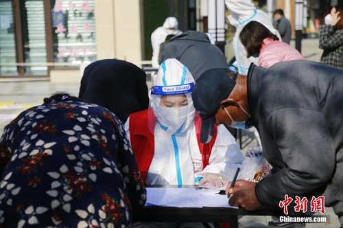 資料圖:青海省西寧市城西區(qū)一核酸檢測(cè)采樣點(diǎn),居民進(jìn)行信息登記。中新社記者 馬銘言 攝