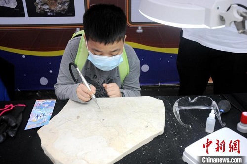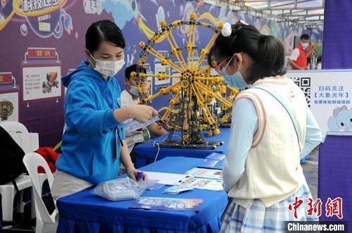 圖為:活動現(xiàn)場,青少年正在互動體驗?!×谓ㄆ?攝