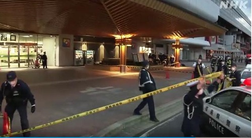 當(dāng)?shù)貢r(shí)間15日下午,日本鐵路公司(JR)福島站西口處,一名高齡女性被刀刺傷。警察正在封鎖現(xiàn)場。圖片來源:日本放送協(xié)會(huì)(NHK)報(bào)道截圖。