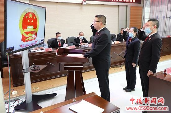 會前,舉行了新提任干警憲法宣誓儀式。在全體黨組成員的監(jiān)誓下,在全院干警的見證中,新任黨組成員林昌左手撫按《中華人民共和國憲法》,右手舉拳進(jìn)行領(lǐng)誓,新提任干警凌建勇和蘭梅珍跟隨舉拳,莊嚴(yán)跟誦憲法宣誓詞。