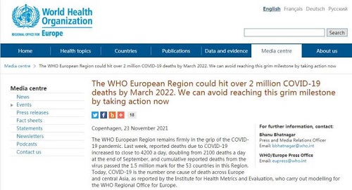 當(dāng)?shù)貢r間23日,世界衛(wèi)生組織歐洲辦事處警告稱,到2022年春天,歐洲區(qū)域新冠累計死亡人數(shù)預(yù)計將超過220萬人。(圖片來源:世界衛(wèi)生組織歐洲辦事處官網(wǎng)截圖)