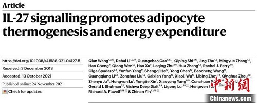 相關(guān)研究論文于11月24日在國際頂級學(xué)術(shù)期刊英國《自然》(Nature)雜志在線發(fā)表。論文題目為“IL—27 signaling promotes adipocyte thermogenesis and energy expenditure”。該項研究突破了對白細胞介素IL—27僅專注于調(diào)節(jié)免疫系統(tǒng)的傳統(tǒng)認知。尹芝南教授為該論文的最后通訊作者,耶魯大學(xué)Richard A Flavell教授、暨南大學(xué)醫(yī)學(xué)部生物醫(yī)學(xué)轉(zhuǎn)化研究院副研究員楊恒文,及暨南大學(xué)附屬珠海市人民醫(yī)院教授陸驪工為該論文的共同通訊作者。暨南大學(xué)附屬珠海市人民醫(yī)院博士后王倩、博士后李德海、暨南大學(xué)醫(yī)學(xué)部生物醫(yī)學(xué)轉(zhuǎn)化研究院副研究員曹廣超,及暨南大學(xué)附屬第一醫(yī)院副教授石綺屏為共同第一作者。