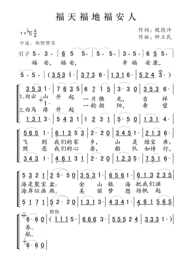 為貫徹落實(shí)省委、省政府關(guān)于加快打造福建文化標(biāo)識(shí)體系、打響福建“?!蔽幕放频臎Q策部署,福安市廣大文藝工作者,創(chuàng)作了一批“關(guān)注‘?!幕⑴c‘?!幕废怼!幕?、發(fā)展‘?!幕钡奈乃囎髌罚F(xiàn)推出由魏德泮作詞,鐘立民作曲,“福”文化主題歌曲《福天福地福安人》,營造“福星高照、福佑中華”的祥和氛圍。