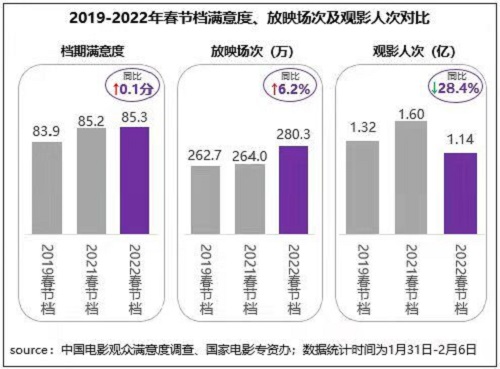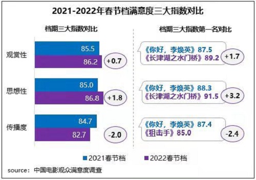 中國電影資料館日前發(fā)布的中國電影觀眾滿意度調查 2022年春節(jié)檔調查結果顯示,春節(jié)檔觀眾滿意度得分85.3分,同比增長0.1分,為2015年開始調查以來同檔期最高分。