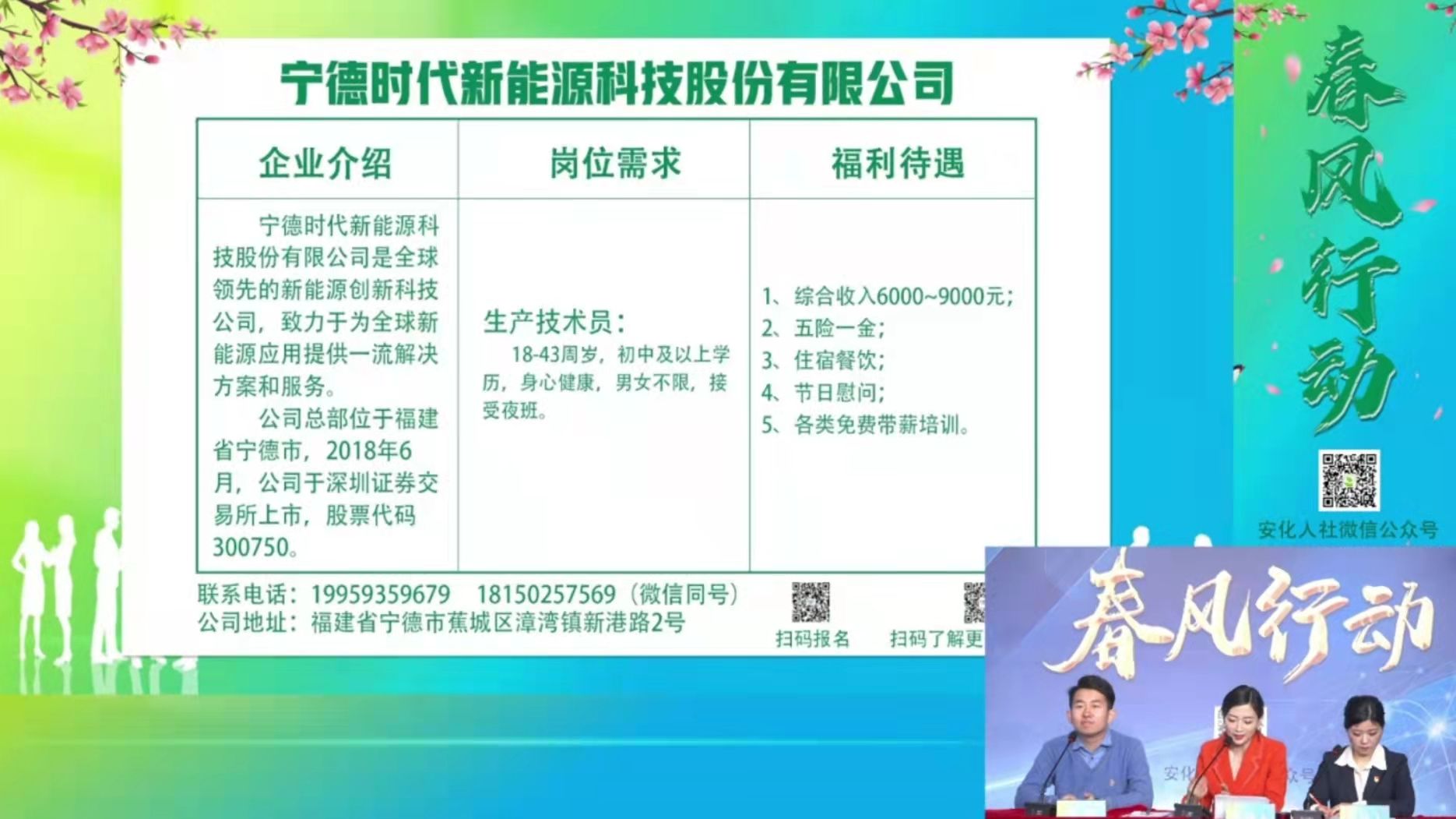 春節(jié)過(guò)后是企業(yè)用工招聘和人才求職就業(yè)的黃金期。為打造“就業(yè)無(wú)憂城市”,吸引更多省外務(wù)工人員來(lái)寧就業(yè),保障轄區(qū)企業(yè)節(jié)后復(fù)產(chǎn)復(fù)工,迎接開(kāi)門(mén)紅,東僑企業(yè)用工服務(wù)專(zhuān)班積極搶抓人才招引先機(jī),聚焦企業(yè)發(fā)展需求,落實(shí)疫情防控常態(tài)化要求,繼2月8日至9日赴河南建立閩豫合作之后,立即于10日攜轄區(qū)重點(diǎn)企業(yè)赴湖南省安化縣開(kāi)展跨省勞務(wù)合作洽談,簽訂兩地勞務(wù)合作協(xié)議,并聯(lián)合舉辦本次線上帶崗直播招聘活動(dòng)。本次直播帶崗活動(dòng)主題是“春風(fēng)送溫暖,就業(yè)送真情”,活動(dòng)由安化縣電視臺(tái)提供技術(shù)支持,東僑開(kāi)發(fā)區(qū)人社局、安化縣人社局、安化縣總工會(huì)等多部門(mén)聯(lián)合開(kāi)展,共有寧德時(shí)代新能源科技股份有限公司、寧德新能源科技有限公司等5家寧德市重點(diǎn)企業(yè)與62家湖南省企業(yè)共同參與,提供上萬(wàn)個(gè)就業(yè)崗位。