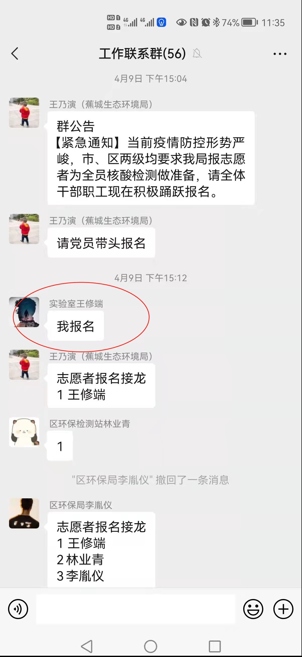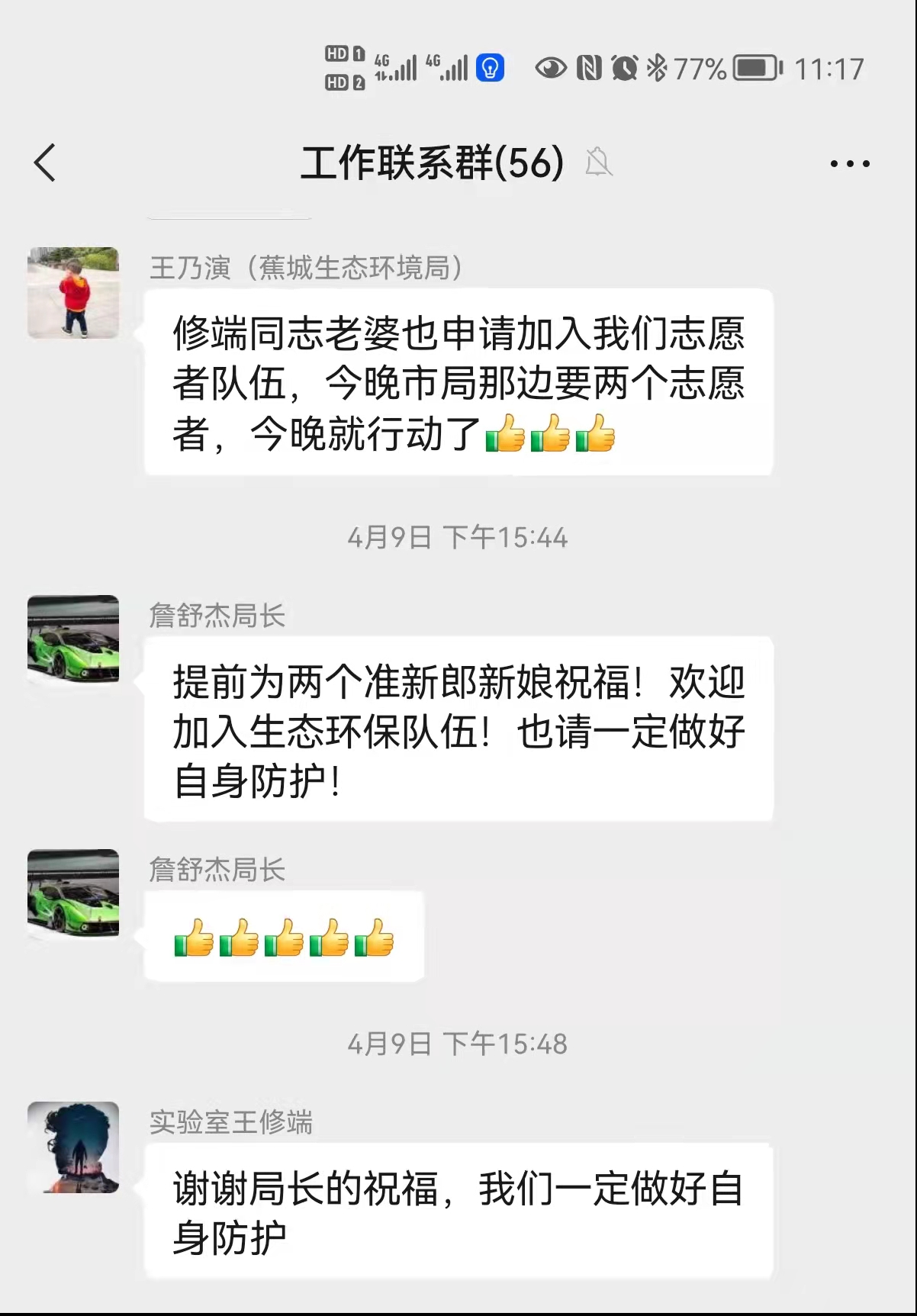 “我參加!”4月9日下午15時(shí),看到工作群發(fā)出動(dòng)員干部爭(zhēng)當(dāng)全員核酸檢測(cè)志愿者后,王修端第一時(shí)間在群里響應(yīng)報(bào)名。隨后,其未婚妻鄭穎也通過王修端申請(qǐng)報(bào)名,成為了一名核酸檢測(cè)志愿者。