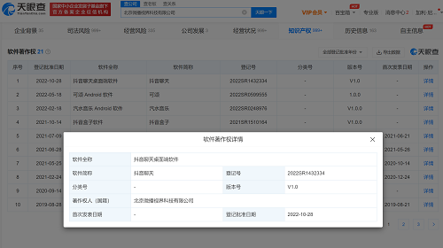 另據天眼查顯示,“抖音聊天桌面端軟件”著作權已于2022年10月28日獲得登記批準,著作權人為北京微播視界科技有限公司,版本號為V1.0。(中新財經)