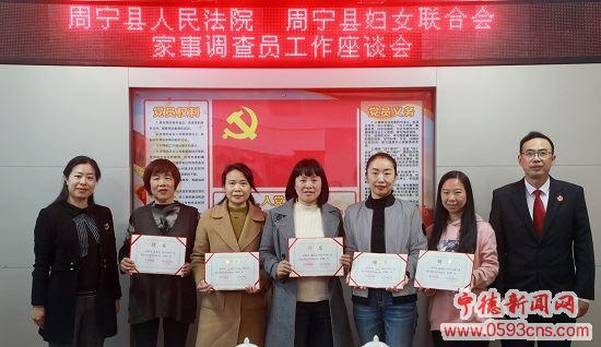 日前,周寧法院與周寧縣婦聯(lián)舉行家事調(diào)查員工作座談會暨聘任儀式,周寧法院、縣婦聯(lián)、縣民政局、縣教育局有關(guān)領(lǐng)導(dǎo)出席會議。與會領(lǐng)導(dǎo)為5名首批聘任的家事調(diào)查員頒發(fā)聘書。