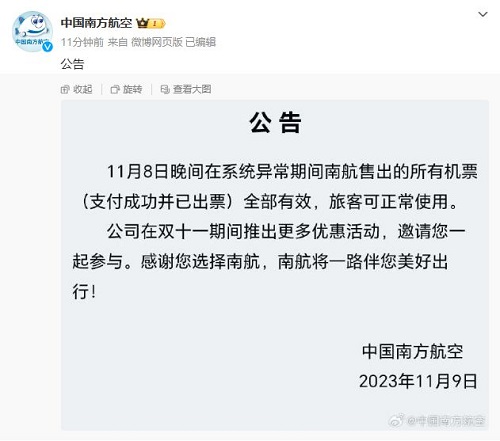 南航:11月8日晚系統(tǒng)異常期間售出機票全部有效