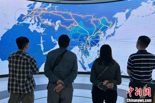 14日,兩岸媒體代表在成都國際鐵路港了解中歐班列線路。記者 王鵬 攝
