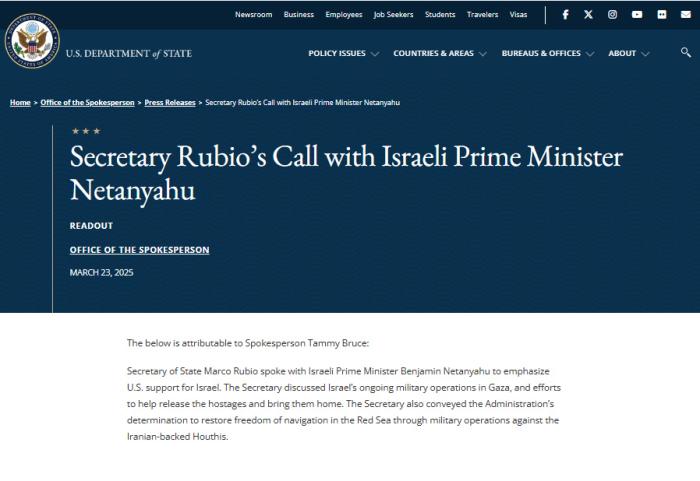 中新網(wǎng)3月24日電 據(jù)美國(guó)國(guó)務(wù)院官網(wǎng)顯示,當(dāng)?shù)貢r(shí)間3月23日,美國(guó)國(guó)務(wù)院發(fā)布聲明表示,美國(guó)國(guó)務(wù)卿魯比奧與以色列總理內(nèi)塔尼亞胡通話,強(qiáng)調(diào)了美國(guó)對(duì)以色列的支持。